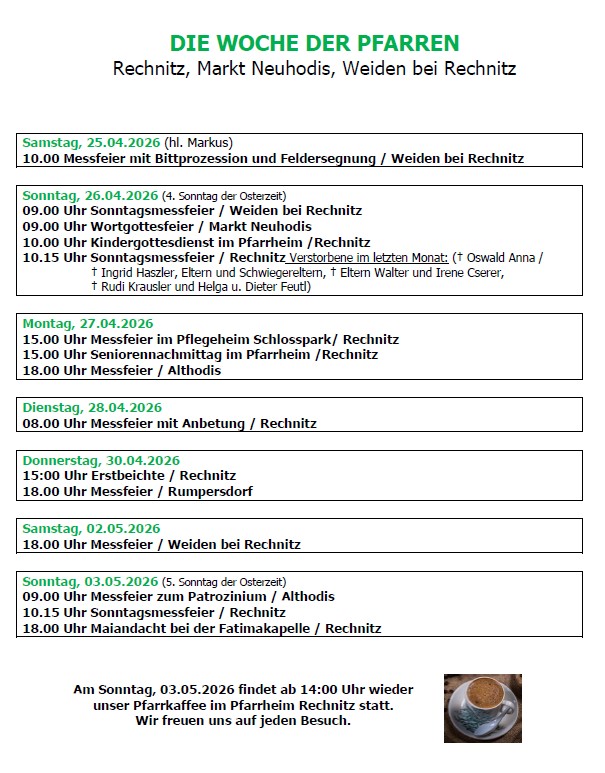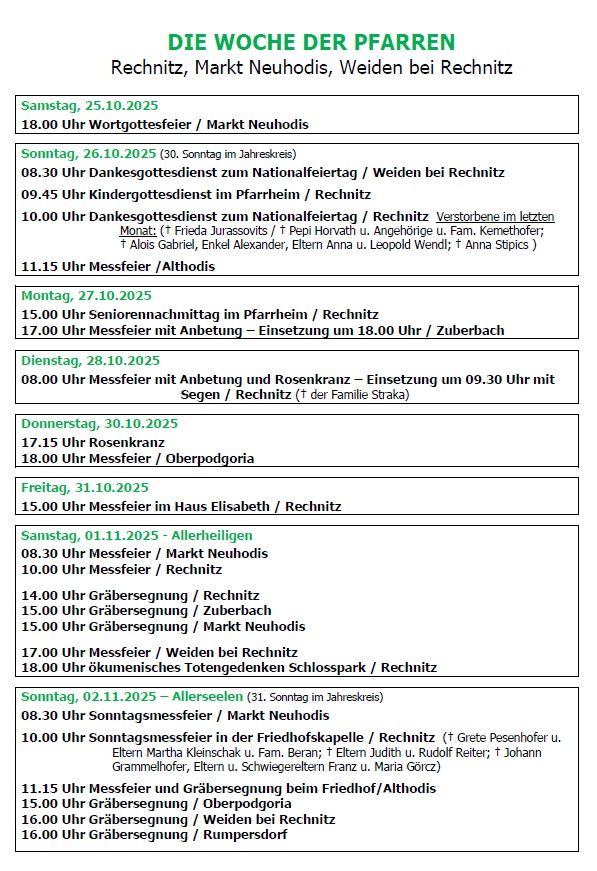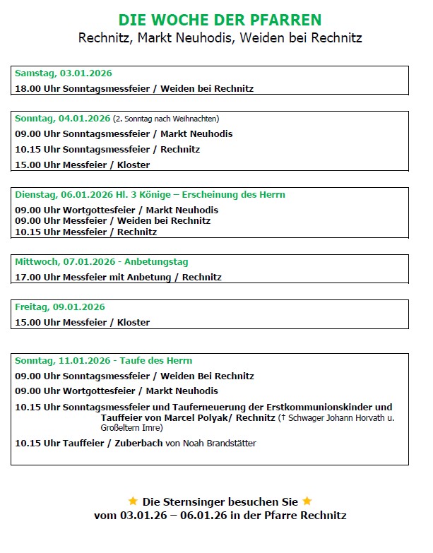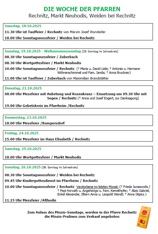![]() | Die Woche der PfarreDas Wochenprogramm wird von der Pfarrkanzlei erstellt.