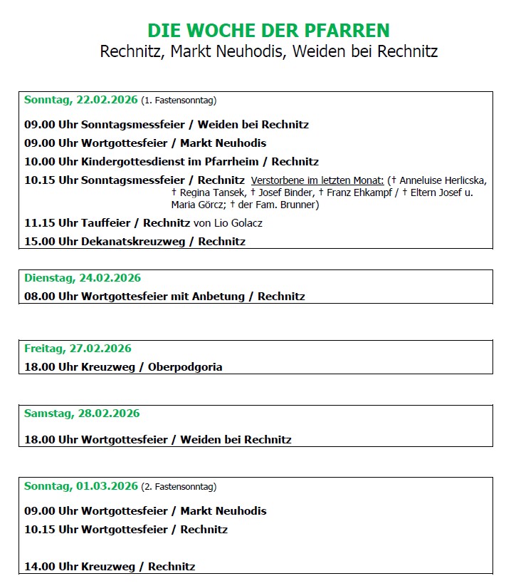 ![]() | Kreuzwegandacht 22.02.2026Am Sonntag 22.02.2026, fand ab 15 Uhr eine Kreuzwegandacht, wetterbedingt in der Pfarrkirche Rechnitz statt. Gläubige aus dem Dekanat Rechnitz sowie anderen Pfarren, nahmen die Einladung an, sich besinnlich auf die Fastenzeit bzw. auf Ostern vorzubereiten. Der Kreuzweg wurde von unserem Herrn Pfarrer Mag. Grandits, den Diakonen, sowie von Mitgliedern des Pfarrgemeinderates aus dem Dekanat Rechnitz, gestaltet und zelebriert. Fotos gibt es hier: photos.app.goo.gl/Ezr2yvghoF5FHGMDA