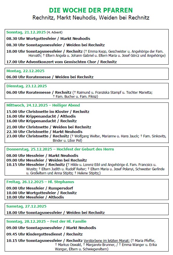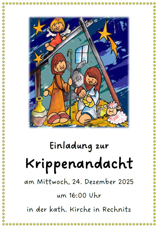 ![]() | Krippenandacht 2025Am Mittwoch, 24.12.2025, findet um 16 Uhr, in der kath. Kirche in Rechnitz eine Krippenandacht statt. Du bist herzlich eingeladen! |