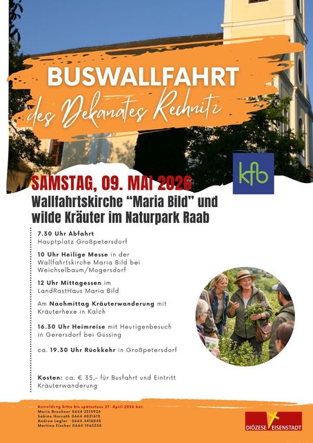 ![]() | Buswallfahrt kath. FrauenbewegungHezliche Einladung zur Buswallfahrt der kath. Frauenbewegung am 9.5.2026. |