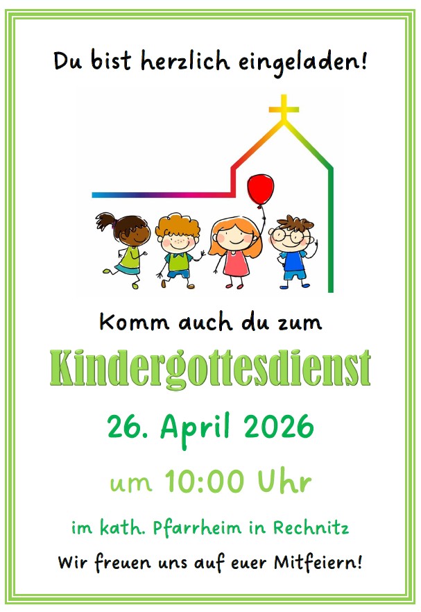 ![]() | Kindergottesdienst April 2026Am Sonntag, 26.04.2026, fand um 10 Uhr, im Pfarrheim der Kindergottesdienst statt. Das Thema des Gottesdienstes März 2026 war "Jesus heilt". Fotos gibt es hier: photos.app.goo.gl/xidMQThqC7DNDnxj6 Das Thema des Gottesdienstes Februar 2026 war "Jesus in der Wüste". Fotos findest du hier: photos.app.goo.gl/ex52CF33PrDkT18a9