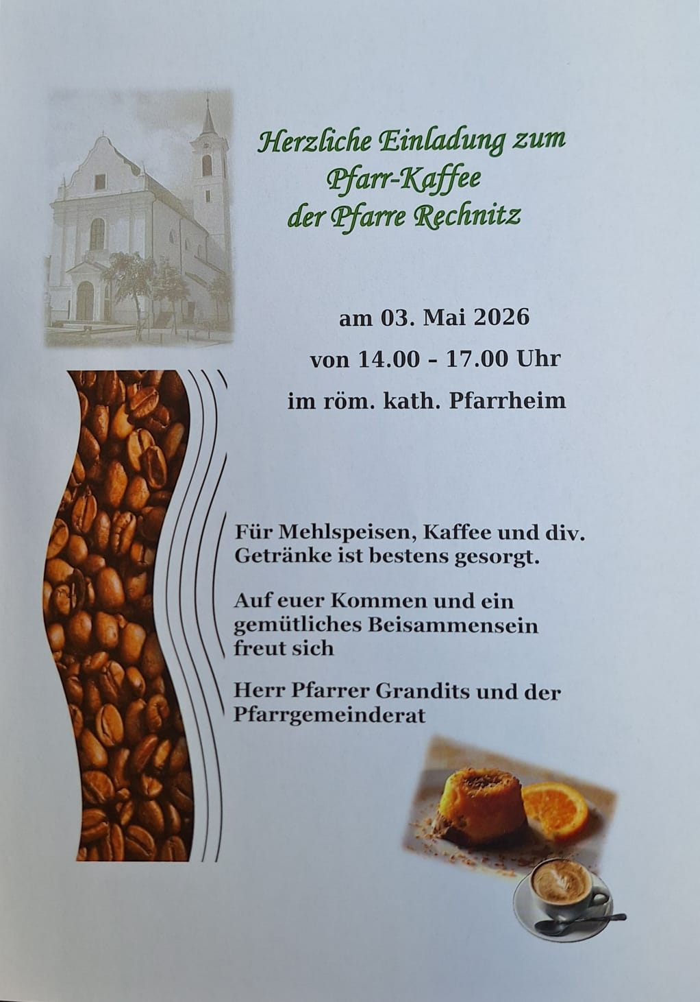 ![]() | Weltgebetstag der Frauen 2026Am 06.03.2026 fand im Pfarrheim Rechnitz der ökumenische Weltgebetstag der Frauen zum Thema „Kommt, lasst Euch stärken!“ statt. Die Liturgie für den Weltgebetstag 2026 haben Frauen aus Nigeria vorbereitet. Wir durften zahlreiche Besucherinnen begrüßen, die mit uns gemeinsam den WGT gestaltet haben (lesend, betend, singend). Hier gibt es Fotos: photos.app.goo.gl/86WiAcGBUu8nqSXS9 |